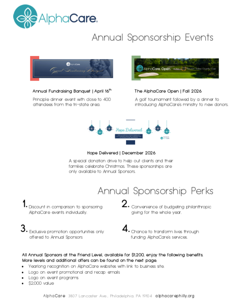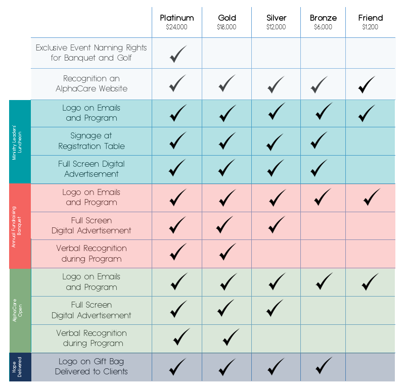 There are various sponsorship levels and payment schedules available. Additionally, there are cost savings in sponsoring every AlphaCare event for the calendar year through one planned gift as an Annual Sponsor over individual event sponsorship.